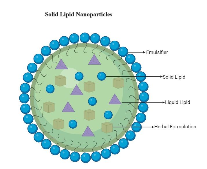 Solid lipid nanoparticles are nanoparticles made of water, solid lipids, and surfactants. They are spherical and their size range ranges from 10-1000 nm. The drug is entrapped inside its solid lipid core. Solid lipid nanoparticles are biocompatible, biodegradable, stable, and versatile [21]. Loading the herbal extract into the solid lipid core offers numerous advantages such as improved bioavailability, controlled and targeted release, and protection of the drug from degradation [22]. Solid lipid nanoparticles can be prepared by various methods like high speed/pressure homogenization, ultrasonication, super-critical fluid evaporation method, etc [21].