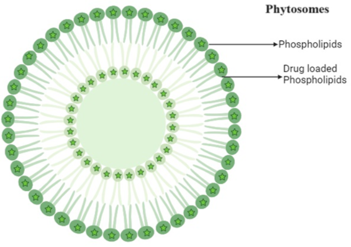 Phytosomes are a type of drug delivery system that is made of phospholipids in which the phytochemicals are loaded and delivered [28]. They are comparatively smaller than liposomes and considered to be promising strategies for delivering phytoconstituents. Phospholipids are made from Soya Phosphatidylcholine (SPC). Egg Phospholipid is also used which contains lysophosphatidylcholine, phosphatidylethanolamine, and sphingomyelin [29].