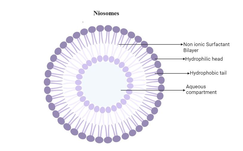 Niosomes are the non-ionic vesicular nanocarrier system made of non-ionic surfactants, with particle sizes ranging from 10-100 nm. It is made of lipids (Cholesterol), non-ionic surfactants, and hydrated medium [31]. Due to the high interfacial tension between water and the hydrophobic portion of the amphiphilic molecules when non-ionic surfactants are exposed to the aqueous environment, a closed bilayer vesicular structure forms. Due to steric and hydrophilic repulsion between the hydrophobic head groups of the non-ionic surfactant, the hydrophilic tail of the substance points towards an aqueous environment. For the development of such sealed bilayer structures, energy in the form of mechanical or heat is needed [32].