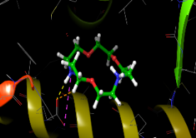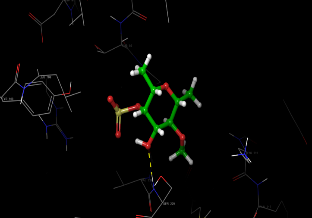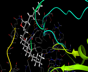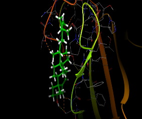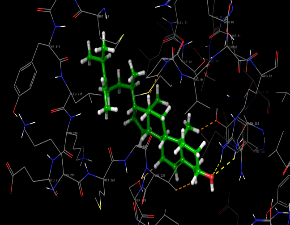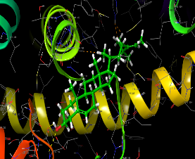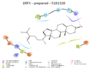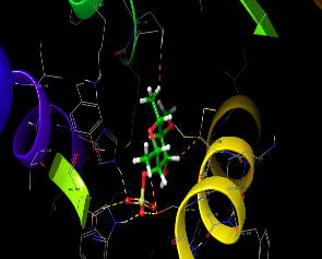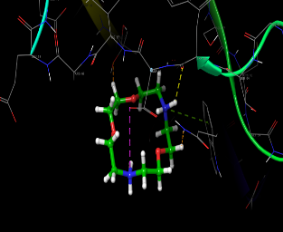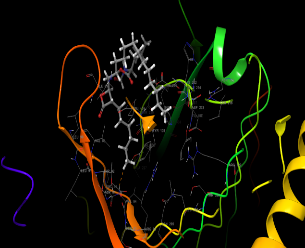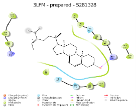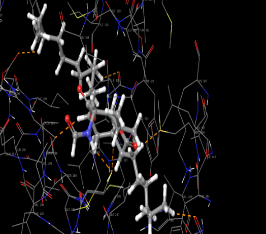 A receptor grid of 10Å x 10Å x 10Å was generated around active site residues fun initial docking of 13 ligand molecules docked with significant docking score. The best lead fucosterol (lead-1) showed the lowest docking showed score of -6.709kcal/mol (figure).