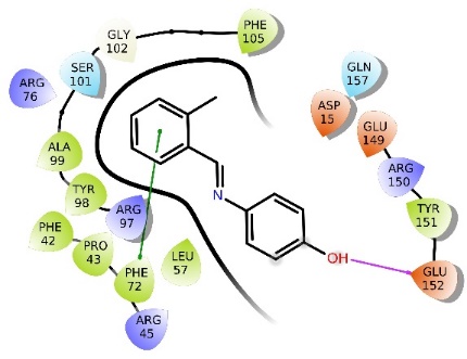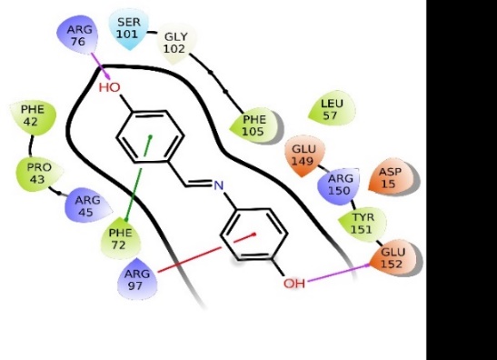 Conclusion: The ligand 4-((4-dichlorobenzylidene) amino)phenol, characterized by its benzene ring, benzylidene moiety, and oxygen group, engages effectively with the HaTMK protein's active sites. This interaction showcases its promising potential as an inhibitor of HaTMK, positioning it as a viable candidate for the treatment of colon cancer.