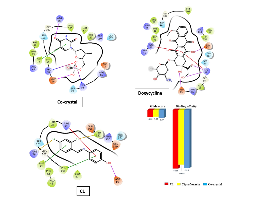Fig. 3: Comparison of glide score and binding affinity between compound1, doxycycline, and Co-crystal