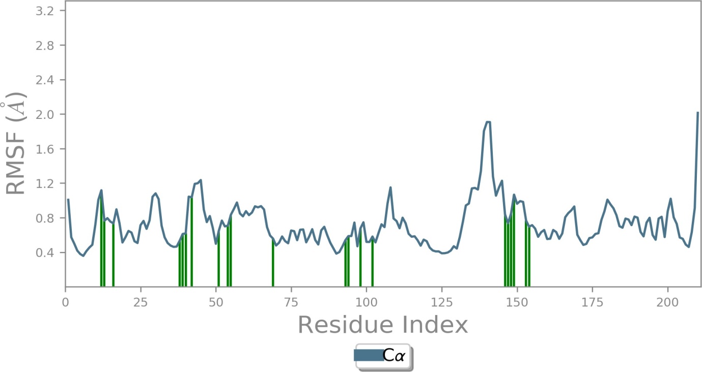 In the RMSF analysis, minimal fluctuations were noted. The Cα atom exhibited initial fluctuations ranging from 0.4 to 1.0 Å, as shown in fig. 5, and this range was consistent throughout the simulations. Specific alterations in ligands interacting with amino acids were detected, with the highest stability recorded between 15 to 155 ns. The period from 150 to 155 ns showed the lowest fluctuations, with amino acid RMSF values between 0.7 to 1.1 Å.