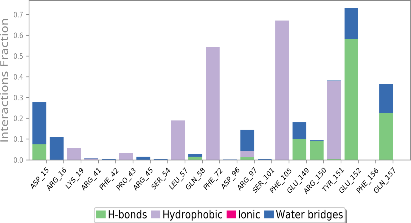 Fig. 7 demonstrates that Phe72 was in consistent contact with the ligands for 90 out of 100 nanoseconds. Similarly, Phe105 was in continuous contact with the ligands from 20 to 100 ns. Tyr151 and Glu152 also maintained uninterrupted contact with the ligands throughout the same period, from 20 to 100 ns. The protein-ligand interactions are depicted in the 2D diagram presented in fig. 8.