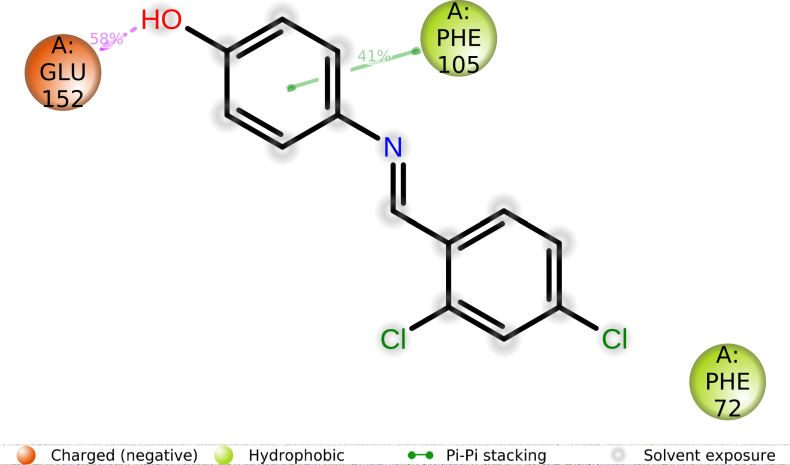The molecular dynamic simulations of the ligand 4-((4-dichlorobenzylidene) amino)phenol, referred to as compound 1/1E2D, were conducted over a 100 ns period. This study provided insights into various metrics, including RMSD, root mean square fluctuations (RMSF), fractions of protein-ligand interactions, timelines of protein-ligand contacts, and a 2D diagram representing protein-ligand contacts. The stability of the docked pose for compound 1/1E2D was assessed through RMSD, focusing on the Cα atom's behavior and the fitting of the ligand (lig) to the protein (prot). The Cα atom displayed fluctuations between 0.5 to 1.6 Å, and the fit of the ligand to the protein exhibited a similar range of 0.6 to 1.6 Å. For 80 ns of the simulation, the Cα atom of the ligand achieved stability, while during the remaining 20 ns, it showed moderate stability. The fit of the ligand to the protein maintained stability for 90 ns. It exhibited moderate stability for the remaining 10 ns, contradicting the previously mentioned 20 ns, which seems to be a typo. The ligand demonstrated stable behavior from 0.6 to 1.6 Å between 20 ns to 80 ns. Meanwhile, moderate fluctuations for the ligand, ranging from 0.7 to 1.3 Å, were observed from 0 to 20 ns. These findings are illustrated in fig. 4.
