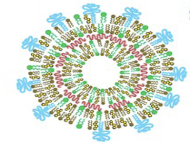 Fig. 3: Nucleic acid-lipid nanoparticle carrier showing the active components, nucleic acid: red coils; cholesterol: yellow circles; helper lipid: brown phospholipid; cationic lipid: green phospholipid; and polyethylene glycol-grafted lipid: blue phospholipid