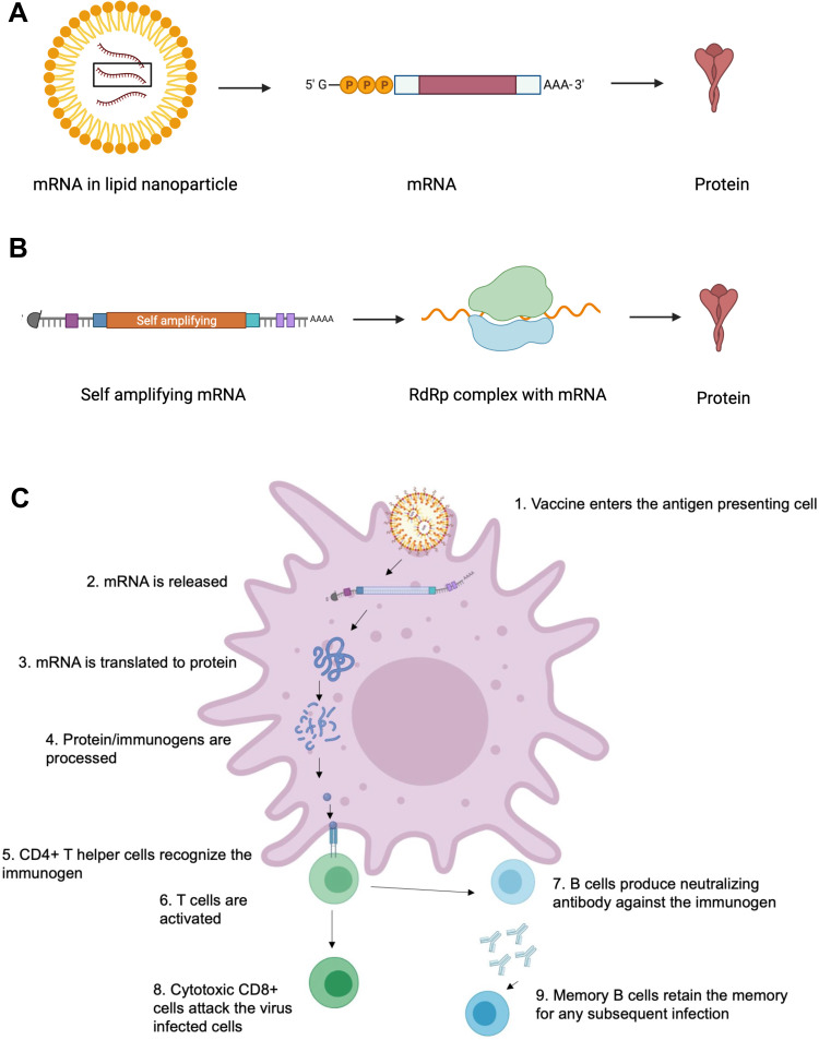 Fig. 5: The mRNA vaccine’s mechanisms [80], (A) Translation of a mRNA vaccine in a lipid nanoparticle into a protein to trigger an immune response. (B) In vivo response to self-amplifying mRNA by RdRp complexing and subsequent protein translation to trigger an immune response. (C) An immune response is observed due to CD4+T helper cell expression and protein identification, concomitantly stimulating B and CD8+T cells. Neutralizing antibodies are produced by B cells, and memory B cells keep their memory for a future infection