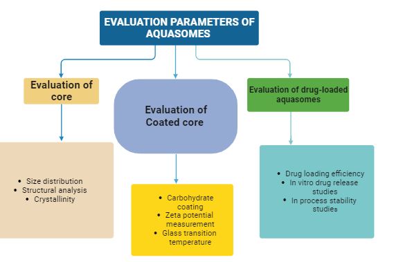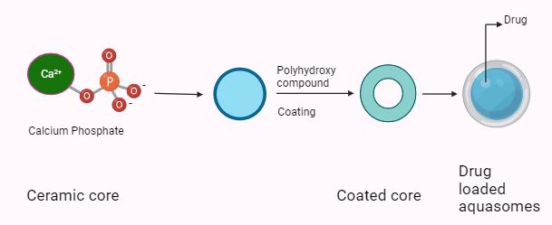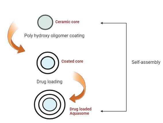 Aquasomes uphold the structural integrity of biochemically active compounds with the help of the assistance of ionic, non-covalent, and entropic forces. The ceramic core stability is ensured by a polysaccharide film. The water-like characteristics of aquasomes offer a foundation for maintaining the conformational integrity and biochemical stability of bioactive substances Carbohydrate is introduced into a core dispersion, and subsequent steps involve sonication, followed by lyophilization. The coating can also be achieved through adsorption via direct incubation or by adding a non-solvent [27].