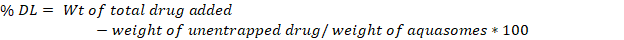 This process is conducted to assess the quantity of pharmaceutical substances bound to the surface of aquasomes. The determination of drug loading involves incubating the aquasome formulation, excluding the drug, in a known concentration of the drug solution for 24 h at 4 °C. Subsequently; the supernatant is separated through high-speed centrifugation lasting 1 hour at a low temperature in a refrigerated centrifuge. Following this, the clear extractive supernatant undergoes filtration, and the analysis of free drug content is performed using a UV spectrophotometer.