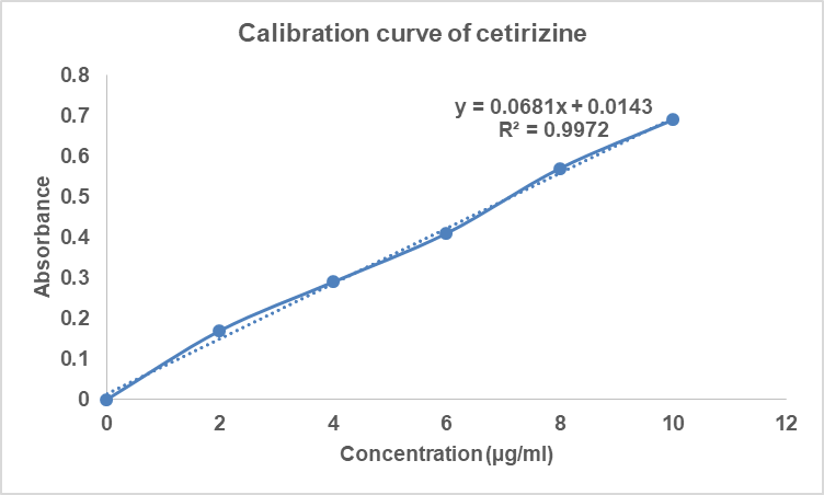 The calibration curve for cetirizine was generated using absorbance data at 230 nm in 0.1 M HCl. Concentrations ranging from 0 to 10μg/ml were measured, and a linear regression analysis yielded an R² value of 0.9972. This high correlation coefficient demonstrates a strong relationship between concentration and absorbance, enabling accurate quantification of cetirizine in future analyses. The calibration curve serves as a reliable tool for determining cetirizine concentrations [27].