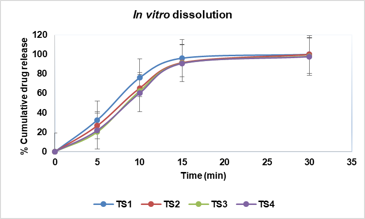 According to the IP standard, the desired drug release limit is 85% within 30 min. The data shows that all formulations exceeded this standard, with TS1 and TS2 achieving drug releases of 99.98% and 99.91%, respectively, at the 30 min mark. Formulations TS3 and TS4 also exhibited high drug releases of 98.11% and 97.64%, respectively, within the given time frame. Based on these results, all the formulations demonstrated excellent drug release profiles, surpassing the IP requirement. However, formulations TS1 and TS2 exhibited the highest drug releases, indicating their potential for efficient drug delivery [35-38].