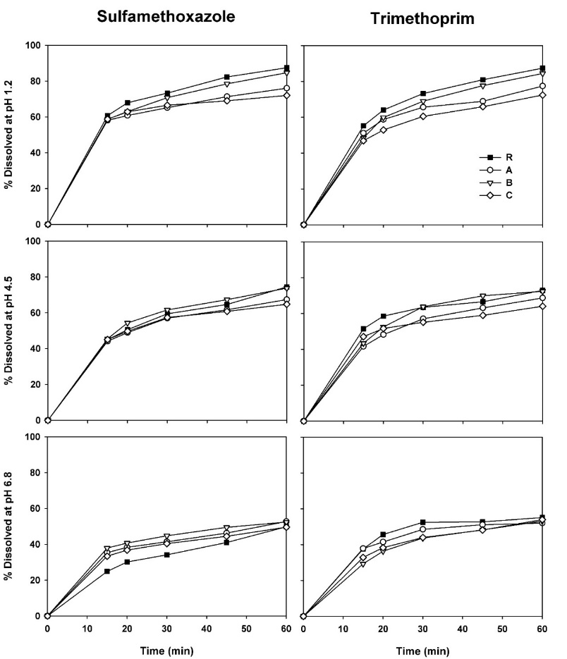 Results: In all conditions, similar dissolution profiles were found excepting for TMP of C drug product at pH 1.2 (f2<50). With model-independent comparisons significant differences in in vitro release performance of SMZ and TMP from all multi-source formulations were found (*P<0.05). When comparing the hypothetical Cmax and AUC0-inf of both drugs with in vivo data PE<15% were found only with reference and one formulation at pH 1.2.