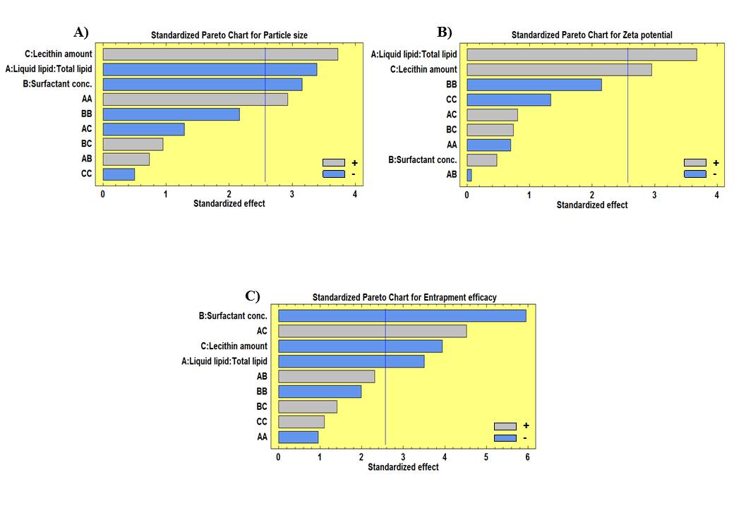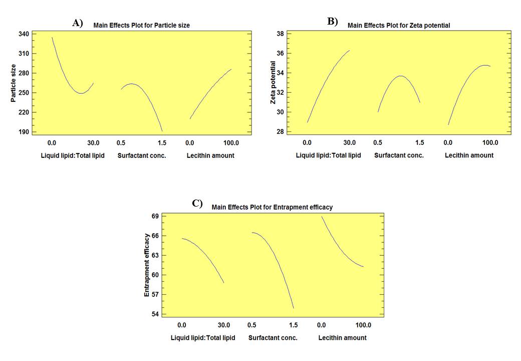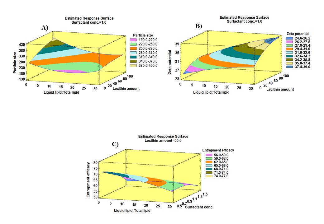 A 33-BBD was used to optimize different variables in formulation of FLUTAMIDE-loaded nanocarriers (NCs). Three independent variables are selected to be liquid lipid percentage from total lipid (X1), Surface Active Agent (SAA) concentration (X2), and lecithin concentration (X3) to investigate their outcome on the designated dependent variables. Our objectives are to minimize mean vesicular size (Y1) while maximizing both the Zeta Potential (ZP) (Y2) and entrapment efficiency (Y3). A description of the different variables, with their levels, and the designated responses are revealed in table 1. A total of 15 experimental trials were generated with triplicate center points. According to BBD, the components of the generated flutamide-loaded nanocarriers are revealed in table 2. ANOVA was used as a statistical test to analyze the significance of factors, effects, and interactions between them via Statgraphics® Centurion XV software, version 15.2.05, (StatPoint, Inc., Warrenton, VA, USA), where the mathematical relations were elucidated as polynomial equations.