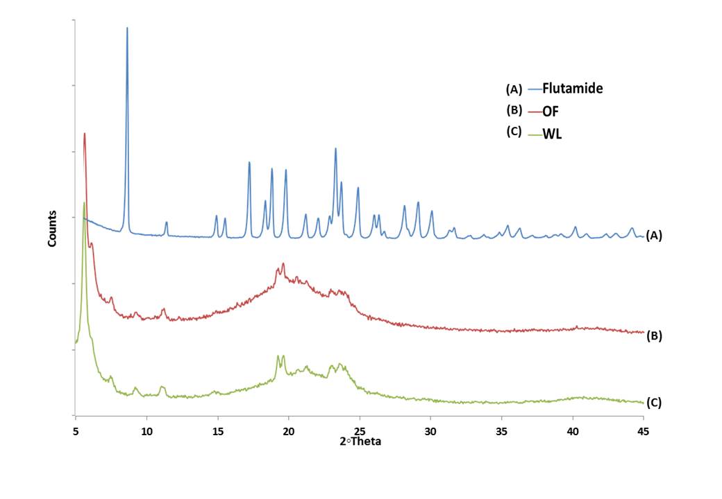 A modern diffractometer (Bruker, D8 Advance, Germany) with Cu Kα1 radiation (λ = 1.54060) at 40 kV and 40 mA between 5° and 80° (2θ) at room temperature, with a step size of 0.05° and a scan speed of 1°/min, was used to detect X-ray diffractograms for pure flutamide, lyophilized OF, and lyophilized WL [19].
