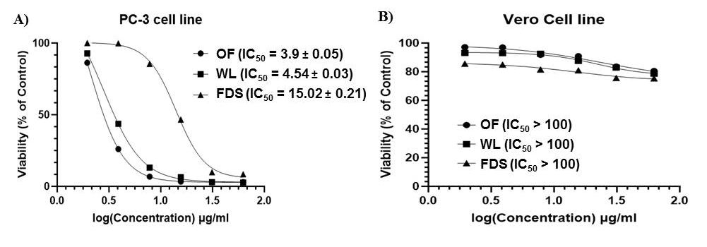 Fig. 7: Cytotoxicity assay against (A) prostate cancer cell line (PC-3), and (B) normal hamster kidney cell line (VERO), Results presented as mean