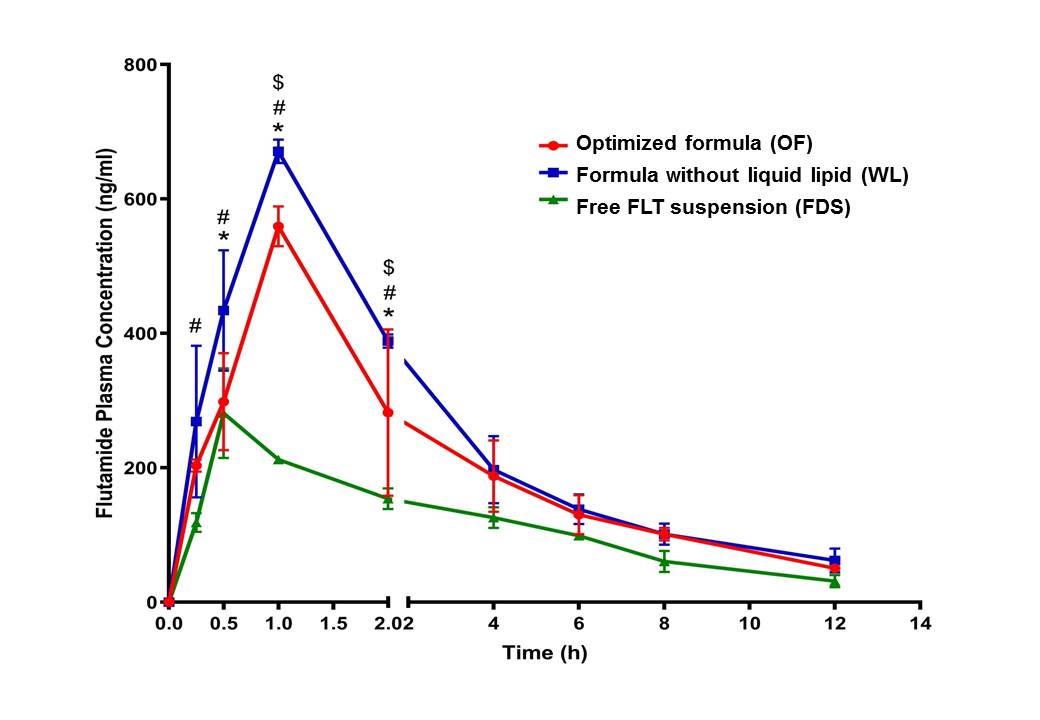 Fig. 8: Plasma concentration-time curve of Flutamide (flutamide) after single oral administration of 26 mg/kg of flutamide-loaded optimized formula, flutamide-loaded formula without liquid lipid, and free flutamide suspension, Note: # Significant difference between WL vs FDS at P<0.05, * Significant difference between WL and OF at P<0.05, and $ Significant difference between OF vs FDS. Results presented as mean±SD