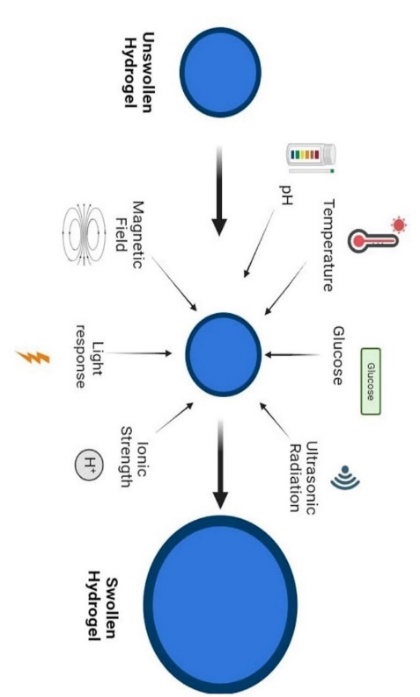Phase transition results from changes in the external environment in each of these situations, and these changes affect the polymer's ability to absorb water or its swelling behavior. These changes can be attributed to changes in ionic strength, pH, current, ultrasonic velocity, and other variables which are explained in fig. 2.