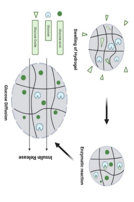 Specialized elements, frequently glucose-binding molecules or enzymes, are incorporated into these hydrogels by carefully placing them within their matrix. These responsive elements experience particular structural or conformational changes in response to variations in glucose levels. As a result, the hydrogel undergoes reversible swelling or deswelling, which is directly correlated with changes in the concentration of glucose. Applications such as drug delivery systems, where the hydrogel can release encapsulated substances, like insulin, in a glucose-dependent manner, are made possible by this dynamic behavior. The complex interaction between glucose and the hydrogel produces a responsive system with great potential for novel biomedical applications, especially in the field of diabetes treatment. Researchers are continuously improving their composition and design to maximize these hydrogels sensitivity, accuracy, and general performance for medical and diagnostic applications [69].