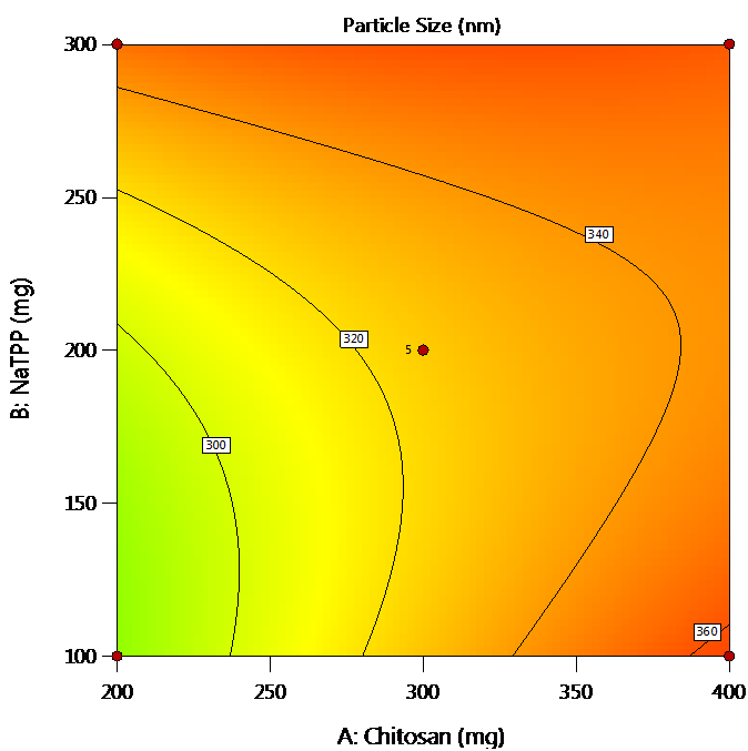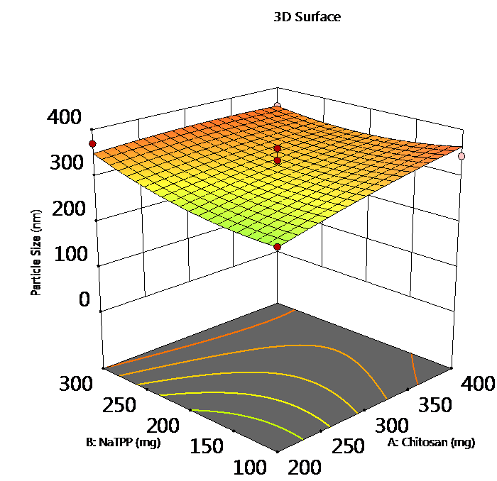 Where Y1 = Particle size, X1 = Concentration of chitosan, X2 = Concentration of NaTPP, X3 = Volume of NaTPP