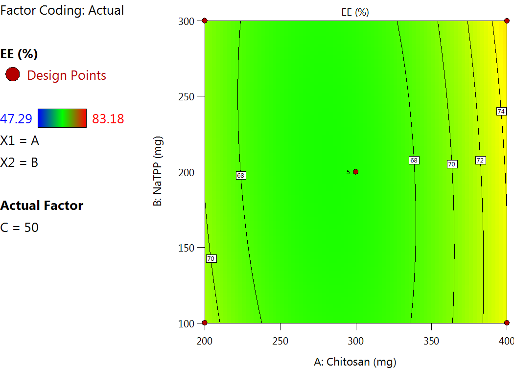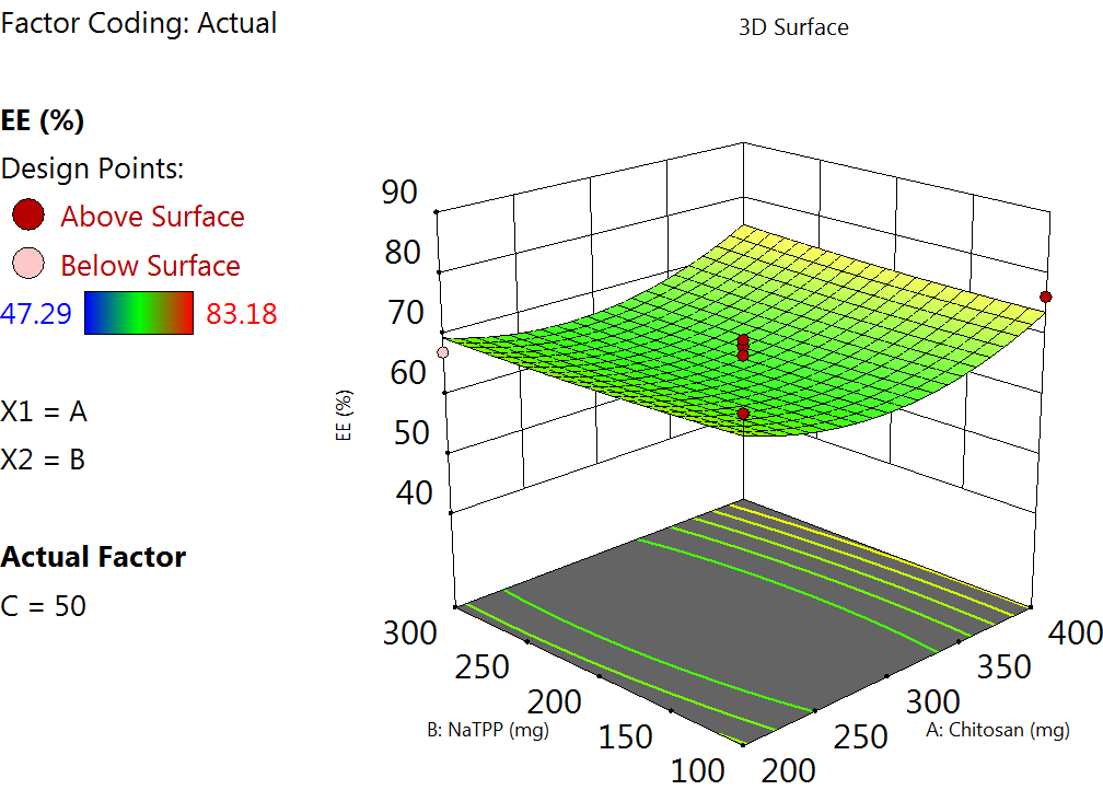 % EE ranging from 51.66 to 83.2% was observed as shown in table 1. The highest %EE was produced by the medium NaTPP volume, the lowest the chitosan content, and a medium concentration of NaTPP. ANOVA was used to examine the mathematical model's fit and significance for this estimate. To get the response shown in fig. 2, the findings of the %EE investigation were fitted using the response surface quadratic model.