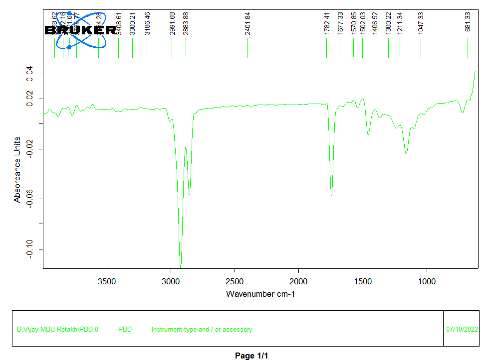 Both the drug and its excipients were subjected to ATR spectroscopy. A bench-top spectrometer was used to record the spectrum (Bruker Tensor 27, Germany). The range of 4000-400 cm-1 was used for the scanning of the powdered samples [26, 27].