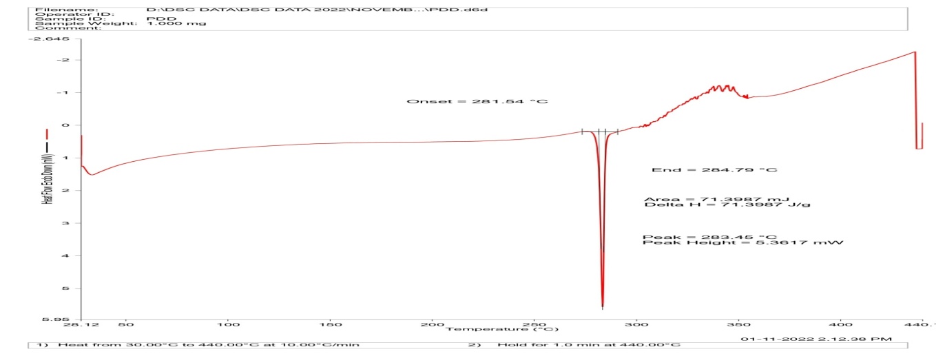 The pure drug was subjected to a Differential Scanning Calorimetric (DSC) analysis to ascertain the component compatibility and crystalline behavior. DSC was used to conduct a DSC study (Q10 V9.9, Waters Corp., USA). The standard was indium. Scanning was performed using an empty aluminum pan and temperatures between 30 and 300 °C at a rate of 10 °C per min with a nitrogen flow rate of 60 ml/min [28, 29].