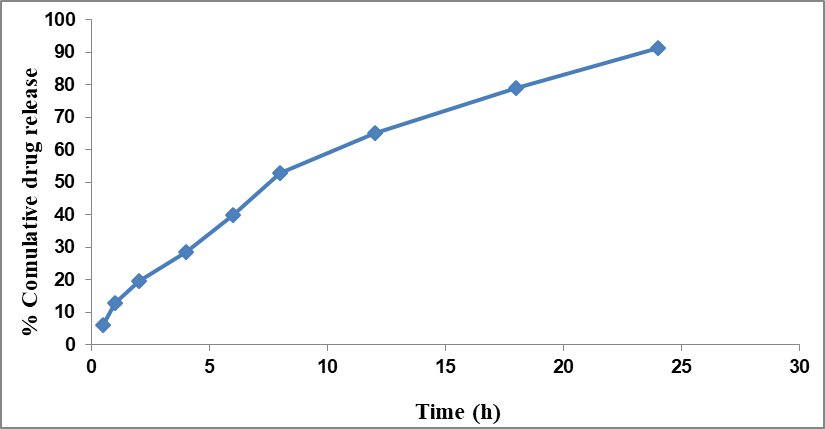 When the characteristics NPs were revealed, we need to verify the release of DSB. This is one of the main parameters of the carrier [39-40]. Formulation NP-7 was chosen for further in vitro drug release investigation due to its small particle size and good entrapment effectiveness. There was a 91.37% cumulative release of the drug from optimized formulation (NP-7) after 24 h in 0.1N HCl at pH 1.2. Fig. 7 shows the results of in vitro drug release investigation.