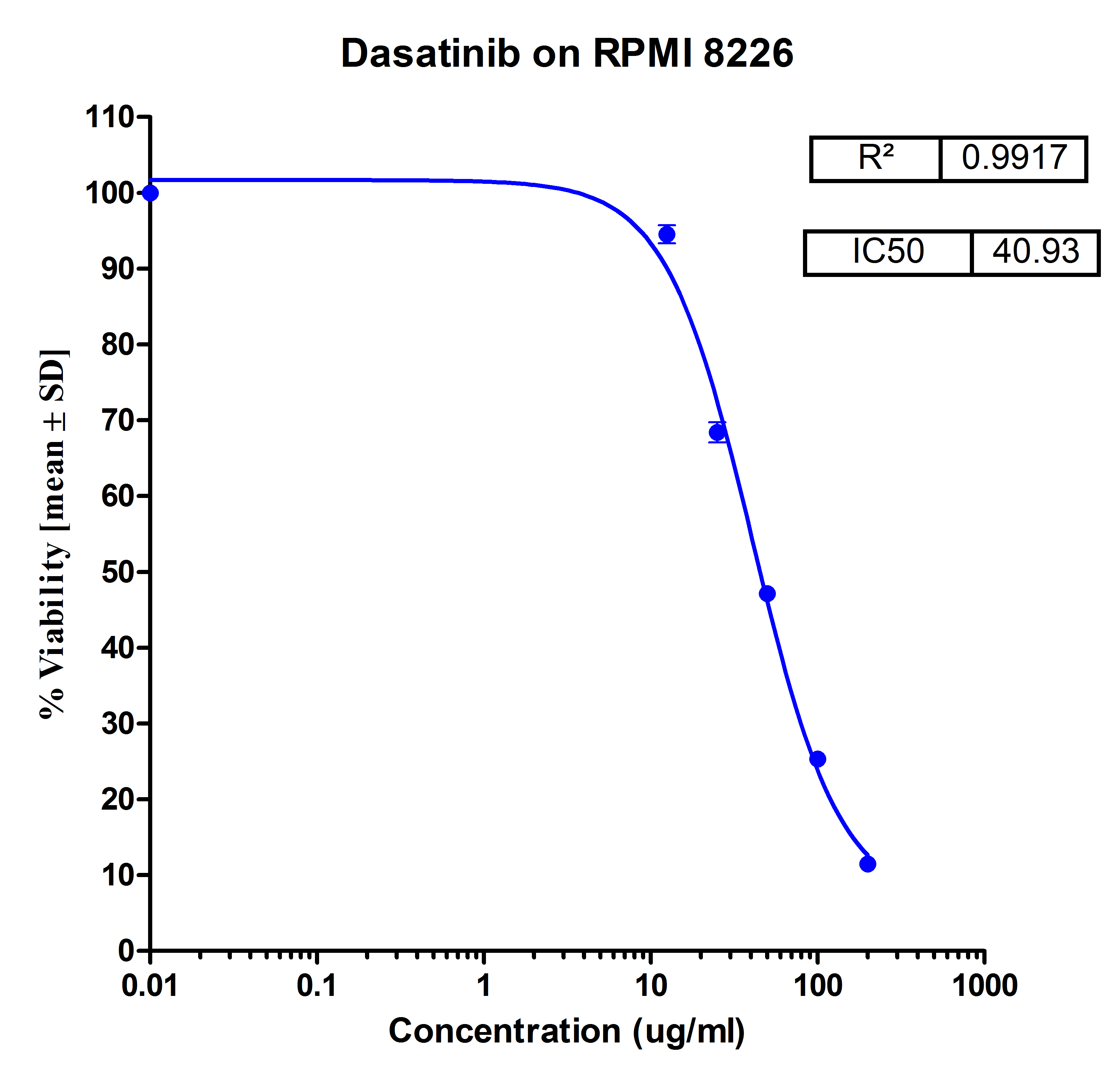 In order to detect the antitumor activity of nanoparticles and pure drug, leukemia cell line RPMI 8226 were selected. The cytotoxic activity of dasatinib monohydrate, both in its pure form and as a loaded chitosan nanoparticle was investigated. Because of its small particles and high entrapment efficiency, the NP-7 formulation was chosen for cytotoxicity investigation. Particle size has a significant impact on absorption of drug in cancerous cell, and a zeta potential value increases cytotoxicity by interacting more strongly with tumorous cell [2]. Particle size and zeta potential may be related to the cytotoxicity of dasatinib monohydrate-loaded chitosan nanoparticles. The cytotoxicity of dasatinib monohydrate was higher when administered in polymeric nanoparticles (NP-7) as compared to its pure form. The delayed release rate of dasatinib monohydrate-loaded chitosan nanoparticles may be responsible for their increased cytotoxicity. When comparing free dasatinib monohydrate and NP-7, the IC50 value was found to be 40.93 μg/ml and 42.18 μg/ml, respectively as shown in fig. 8 and table 5. It is suggested that developed nanoparticles have more significant cytotoxic effects on these cell lines. For dasatinib, cell viability significantly decreased with an increase in drug-loaded nanoparticles [39]. The reason was that nanoparticles increased the water solubility and targeting of drugs, increased the concentration of drugs in cells, and showed a stronger inhibitory effect on cells. The IC50 value reflected the same results [41]. These results revealed that nanoparticle formulation was more effective at cytotoxicity than pure drug.