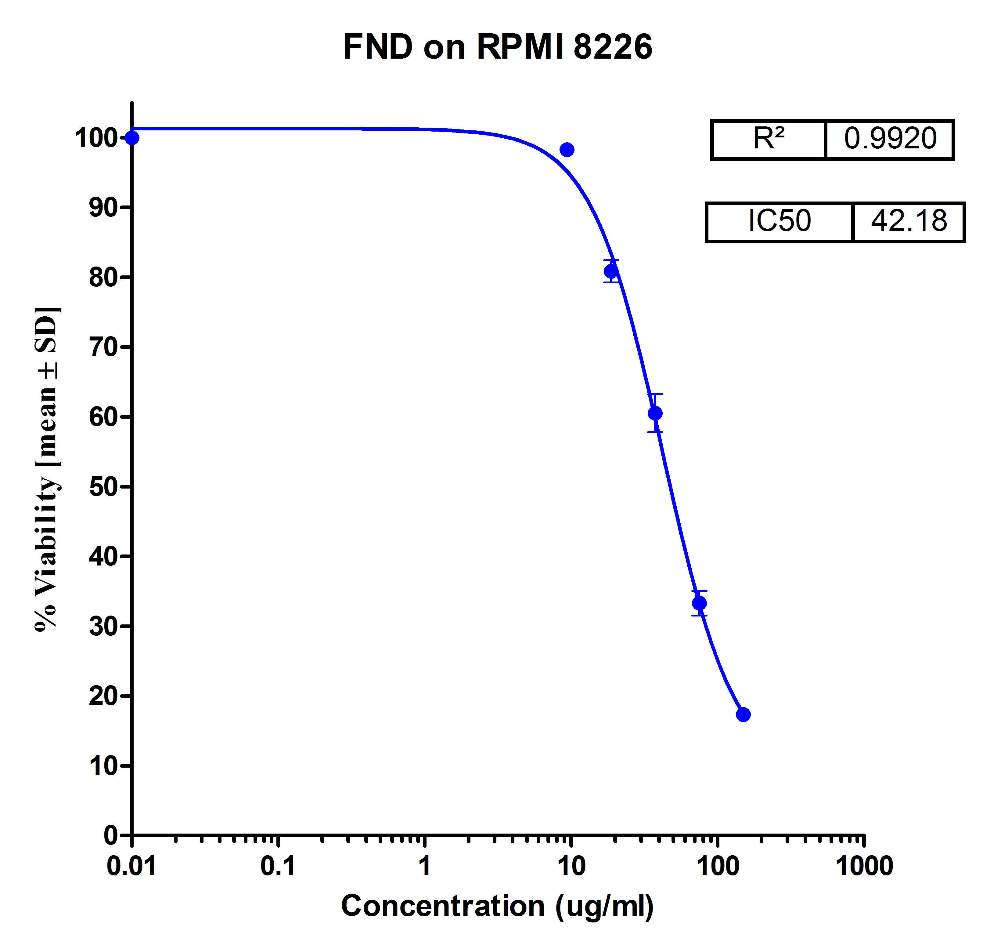 In Dulbecco's Modified Eagle's (DMEM) medium, a leukemia cell line RPMI 8226 from Roswell Park Memorial Institute was obtained and cultured. Centrifuged at 125 g for 5 min after removing the RPMI 8226 from its liquid nitrogen container and adding it to 9 ml of complete culture media. Following centrifugation, 10 ml of full DMEM medium was incorporated into pellets, and the supernatant was discarded. The cells were kept in an incubator with a Carbon Dioxide (CO2) humidifier at a temperature of 37 °C. Once the cell confluency reached around 80%, the cells were separated using trypsin-EDTA and then moved to two T-25 flasks. The test flask was used after the cell confluency reached around 80 to 90% [32].