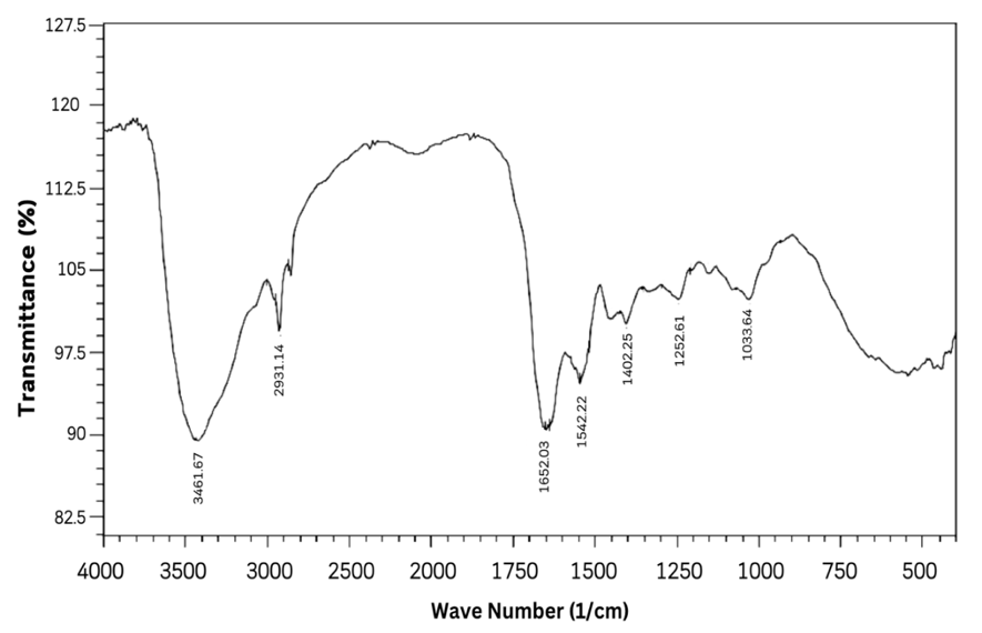 Table 3 presents the absorption peaks of various amide groups, essential for identifying collagen's structure via FTIR spectroscopy. The observed peaks for Amides A, B, I, II, and III in Catfish collagen align with the characteristic absorption ranges for these functional groups, affirming the protein's structure. Notably, Amide I's peak at 1647.21 cm-1 suggests the presence of secondary structures like alpha helices or beta sheets. A slight deviation in Amide III's peak suggests further investigation may be warranted to elucidate implications on collagen's structure or purity [24]. FTIR spectroscopy proves crucial for comparing collagen structures, processing modifications, or verifying protein identities, with broad applications in biomaterials, food science, and biomedical research.