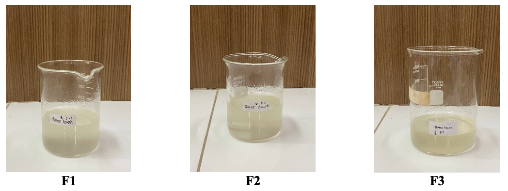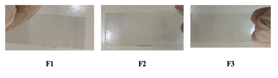 From the images, it seems that all three gel samples (F1, F2, F3) show similar transparency, which could be a good initial indicator of homogeneity. No signs of phase separation or agglomeration were visually visible. All samples appear to have similar consistencies based on their appearance. This suggests that the gelling process may have been carried out by a method that resulted in a uniform distribution of the ingredients in each formula. There were no visible inclusions or trapped air "pockets" in the samples, indicating a good mixing process and possibly high efficiency in providing homogeneity.