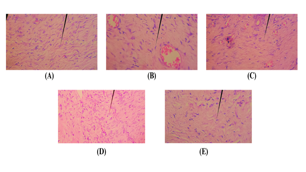 Fig. 5: Histopathological image of fibroblast network. (a) G1; (b) G2; (c) G3; (d) G4; (e) G5; (→) part of fibroblast tissue