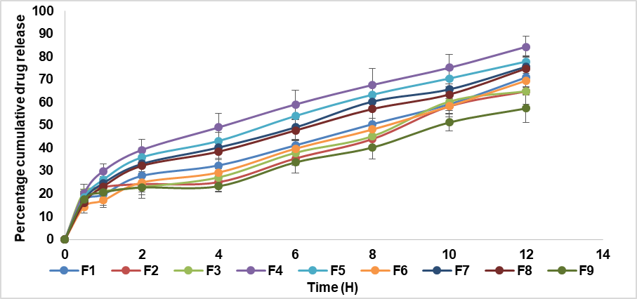 Fig. 1: % Release of gabapentin SLN (F1-F9) (n=3); n= number of determinations