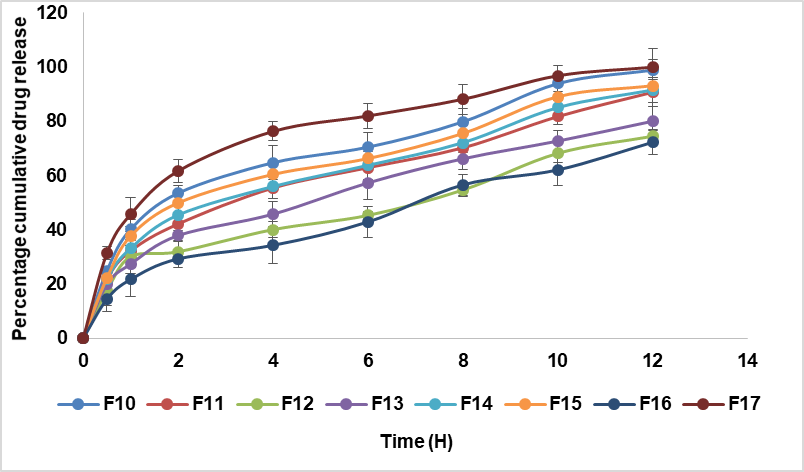 In all of the formulations, it was observed that a maximum of 14% of the drug was released during the first 30 min. The results of the dissolving research indicate that F9 exhibited a minimum drug release of 57.37% within 12 h. In contrast, F17 demonstrated a maximum drug concentration of 99.99% within a 12 h time. An increased quantity of glyceryl tripalmitate resulted in a delayed release of the drug, while a higher quantity of poloxamer-188 accelerated the release of the drug. The amount of gabapentin released from SLNs can vary depending on the lipid matrix’s composition and the proportion of surfactants utilized.