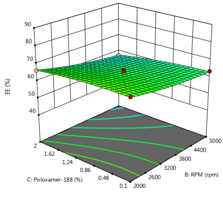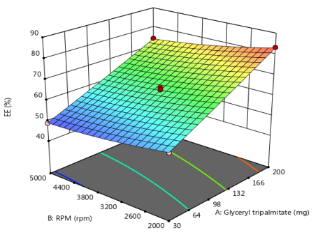 Fig. 3: 3D simulation curve of response 1(EE); Glyceryl tripalmitate Vs RPM, Glyceryl tripalmitate Vs poloxamer-188, Poloxamer-188 Vs RPM