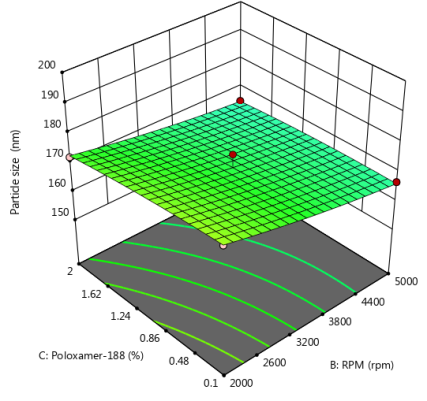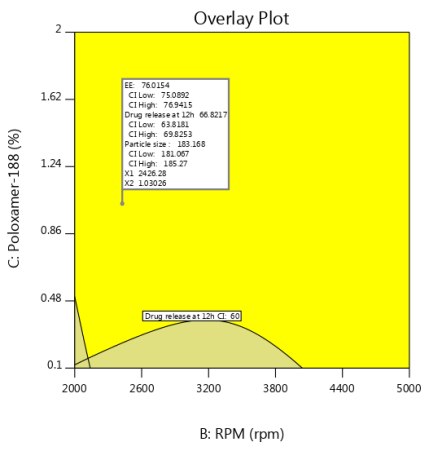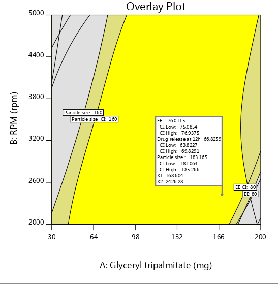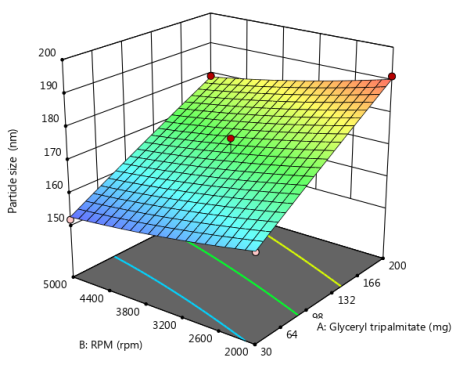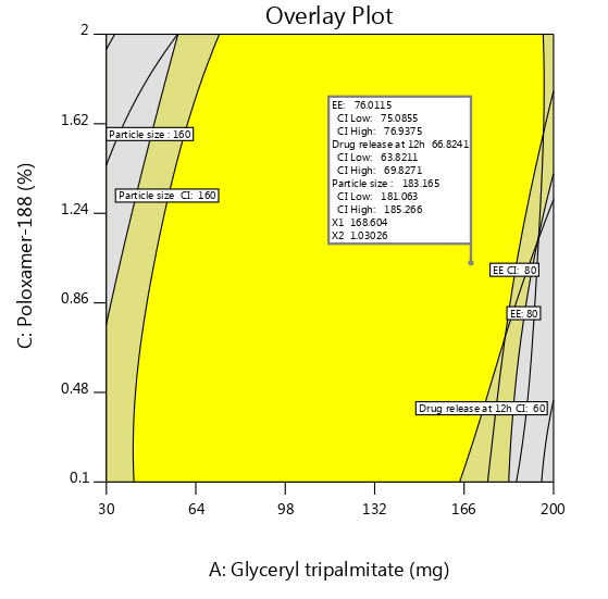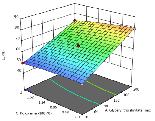 To evaluate the effect of specific independent variables on the replies, the current study used a Box-Behnken experimental design with three levels and three factors. This study took into account three independent parameters: sodium glyceryl tripalmitate (A), RPM (B), and Poloxamer-188 (C). Particle size, drug release at the 12 h mark, and EE (encapsulation efficiency) measures are among the information gathered during the experiment. For mathematical fitting and analysis, the polynomial equation was used [18, 19]. Using a confidence interval value of alpha 0.05, the best formula was found by applying a numerical method along with a graphical optimization strategy. There were 17 experimental runs in the three-level, three-factor Box-Behnken experimental design.