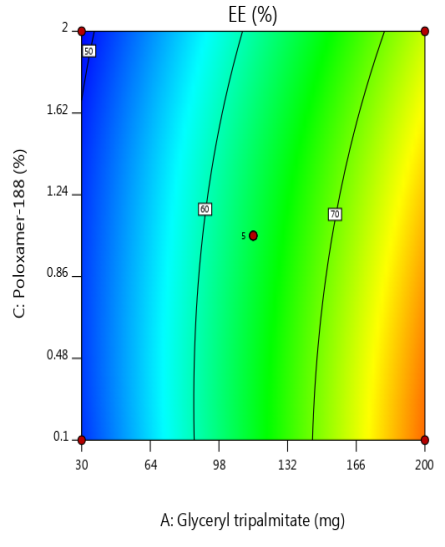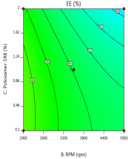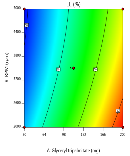 Fig. 4: 2D Contour plot of response 1(EE); Glyceryl tripalmitate Vs RPM, Glyceryl tripalmitate Vs Poloxamer-188, Poloxamer-188 Vs RPM