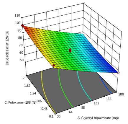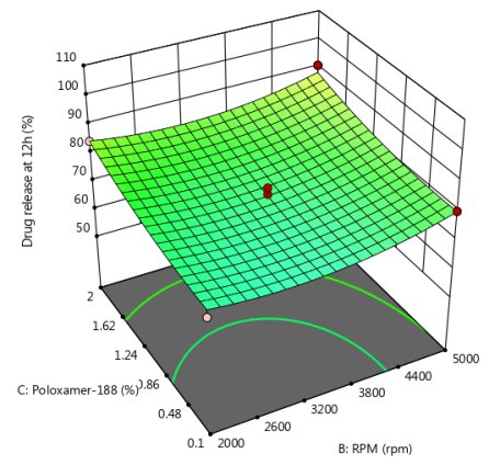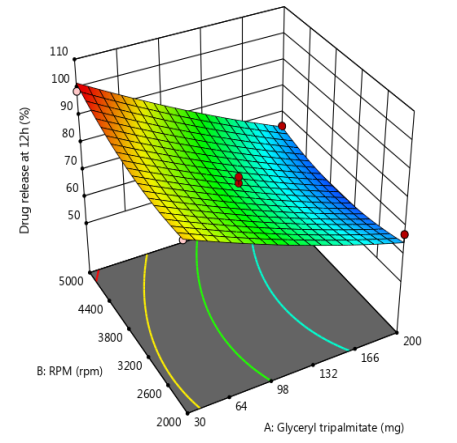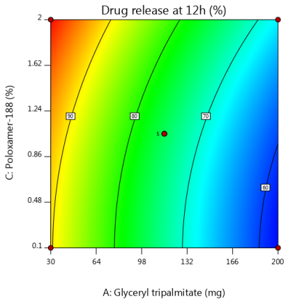 Response 2 [Drug released at 12th Hour] = 75.05-16.12A+2.53B+4.79C-2.48AB+0.16AC-0.67BC+1.49A2+0.03B2+2.29C2…. (2)