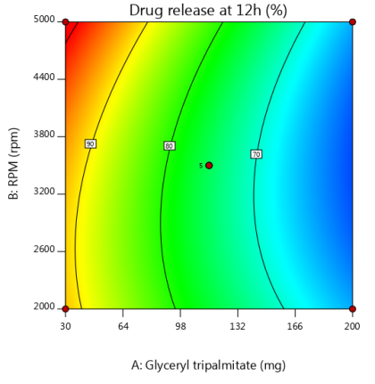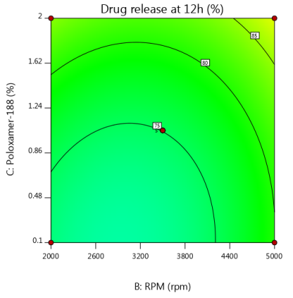 Fig. 7: 2D Contour plot of response 2(Drug released at 12th Hour); Glyceryl tripalmitate Vs RPM, Glyceryl tripalmitate Vs Poloxamer-188, Poloxamer-188 Vs RPM