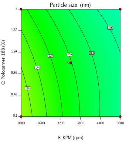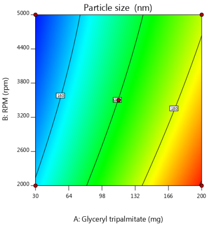Fig. 8: 2D Contour plot of Response 3(Particle size); Glyceryl tripalmitate Vs RPM, Glyceryl tripalmitate Vs Poloxamer-188, Poloxamer-188 Vs RPM