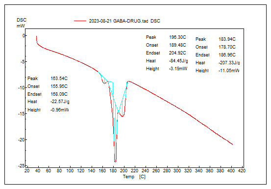 It observed a sharp endothermal peak at 183.94 °C with heat of energy of-207.33 mJ; which is as per the literature study. It also noted impurity peak at 163.54 °C and a thermal degradation peak appeared at 196.30 °C.