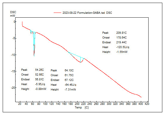 A significant endothermal peak at 208.81 °C, which is close to pure gabapentin as indicated by an earlier measurement of 183.94 °C, was noted in the DSC research (fig. 13). This determined that the endothermal peak had not changed much. It also implied that the pure medication in the SLN formulation would be thermally stable. At 54.26 °C, a large peak was also detected. This peak may have resulted from the complex formed between poloxamer-188 and glyceryl tripalmitate. It was mentioned that sunflower lecithin does not appear to have a pronounced peak.