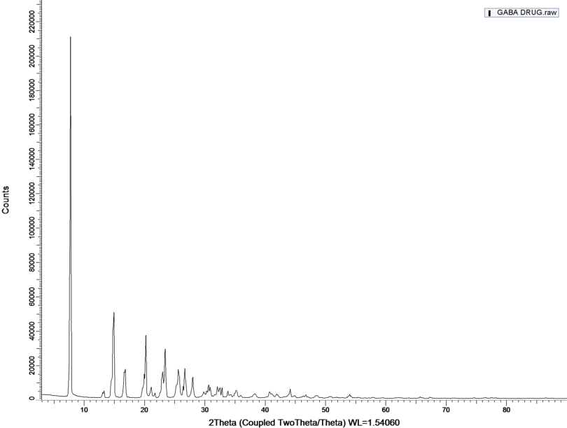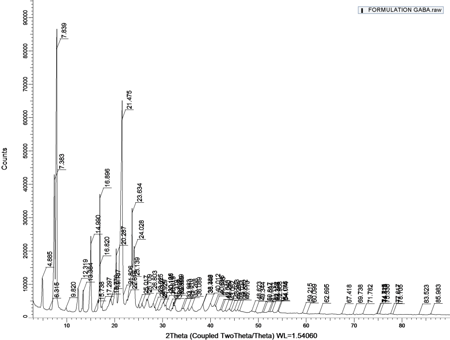 The purpose of the XRD study was to trace pure drug in SLN formulation. Significant distinctive peaks were identified in the XRD investigation (fig. 15), and they were identical to pure gabapentin at positions 7.83, 14.99, 16.89, 20.28, and 21.45 (2Theta). This indicated the presence of pure gabapentin in the crystalline arrangement. However, a few more peaks of intensity reduced to below 3000 were observed; which could be due to the presence of solvent and reduced crystallinity during formulation development.