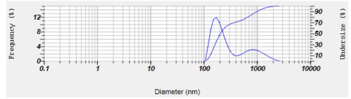 The optimized formulation's average size was found to be 203.4 nm by the particle size analysis. In a similar way, the Polydispersity Index (PI) came back with a 0.426 result. According to published research, a PI value of less than 0.5 denotes homogeneous dispersion, which is what our formulation showed [29].