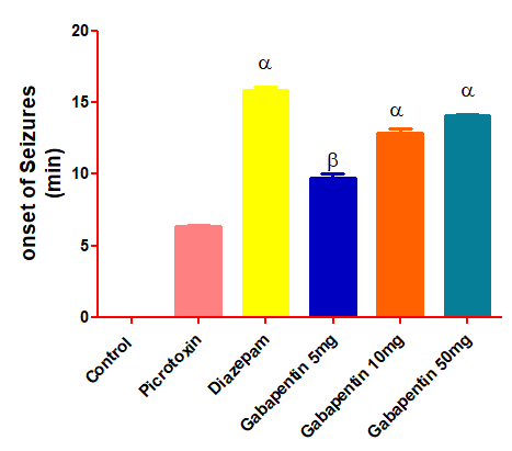 Fig. 19: The effect of gabapentin-SLN on the onset of seizures after the administration of picrotoxin and bicuculline. Data are presented as mean±SD (n = 6) and were analyzed using an ANOVA followed by Tukey’s post hoc test at p<0.05, where αP˂0.001, βP˂0.01 vs picrotoxin and bicuculline