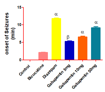 Development of picrotoxin and bicuculline-induced seizures is slower. As shown in the tables 5, 6, and fig. 19, the onset of seizure was significantly faster P<0.001 in the picrotoxin and bicuculline-treated group in comparison to the standard group, whereas in the of gabapentin-SLN treatment groups, the onset of seizures were delayed significantly in comparison to the disease control group.