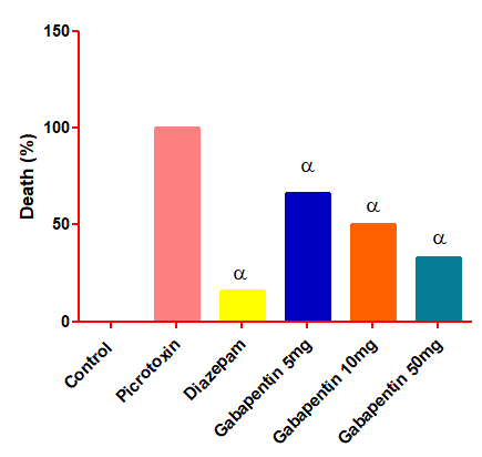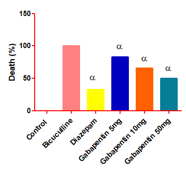 Fig. 20: The effect of gabapentin-SLN on death percentage after the administration of picrotoxin and bicuculline. Data are presented as mean±SD (n = 6) and were analyzed using an ANOVA followed by Tukey’s post hoc test at p<0.05, where αP˂0.001, βP˂0.01 vs picrotoxin and bicuculline