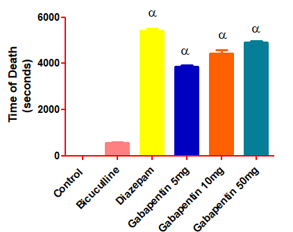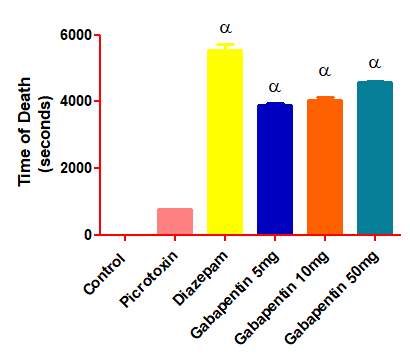 Fig. 21: The effect of gabapentin-SLN on the time of death after the administration of picrotoxin and bicuculline. Data are presented as mean±SD (n = 6) and were analyzed using an ANOVA followed by Tukey’s post hoc test at p<0.05, where αP˂0.001, βP˂0.01 vs picrotoxin and bicuculline