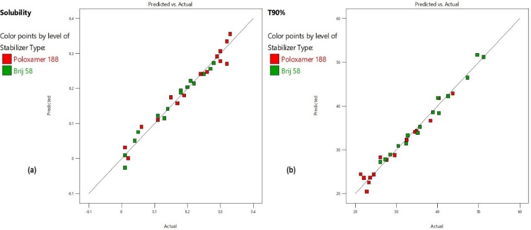 The ANOVA test results showed that the quadratic models for the solubility and the T90% were found to be significant at p<0.05. Also, all the four factors had significant effects at p<0.05 on both the solubility and the T90%. Besides the ANOVA test, Predicted vs. Actual plots for both the responses (fig. 1) illustrated that all the data points were uniformly scattered around the 45 line. This observation indicated that the data can be proceeded for DoE analysis and optimization without the need of transformation [20].