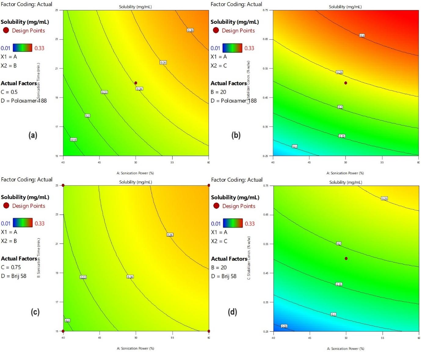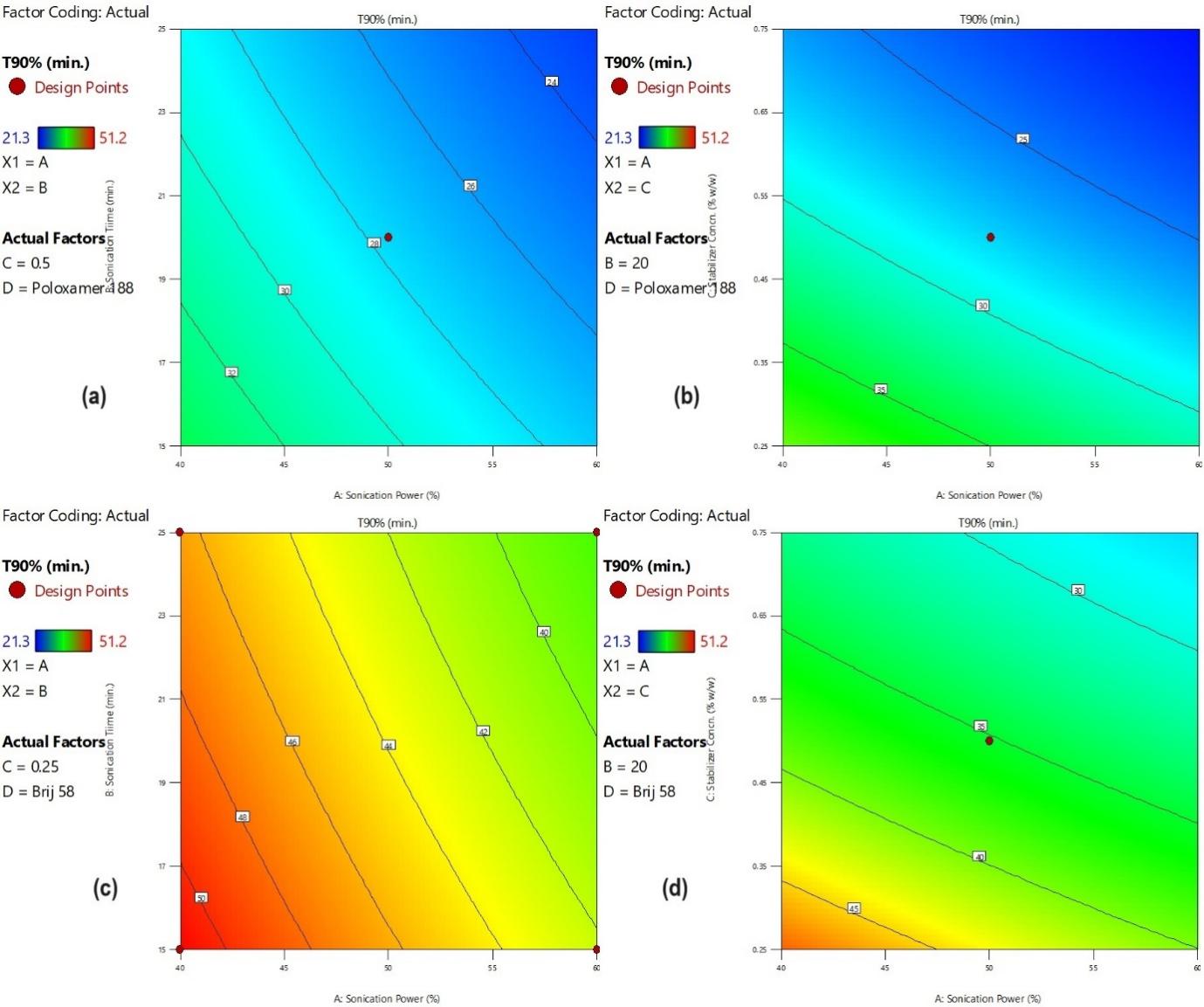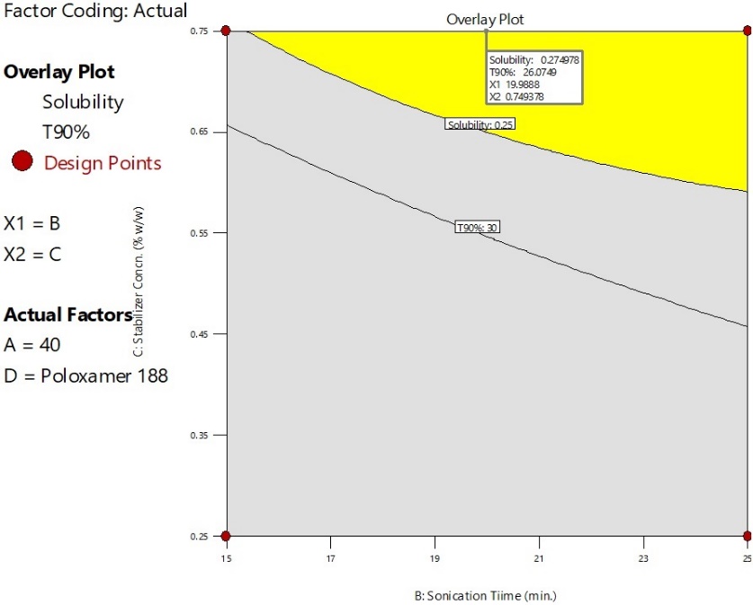A: Sonication power. (40% amplitude) B: Sonication time (20 min.) C: Stabilizer concn. (0.75% w/w) D: Type of stabilizer (PLX-188) |